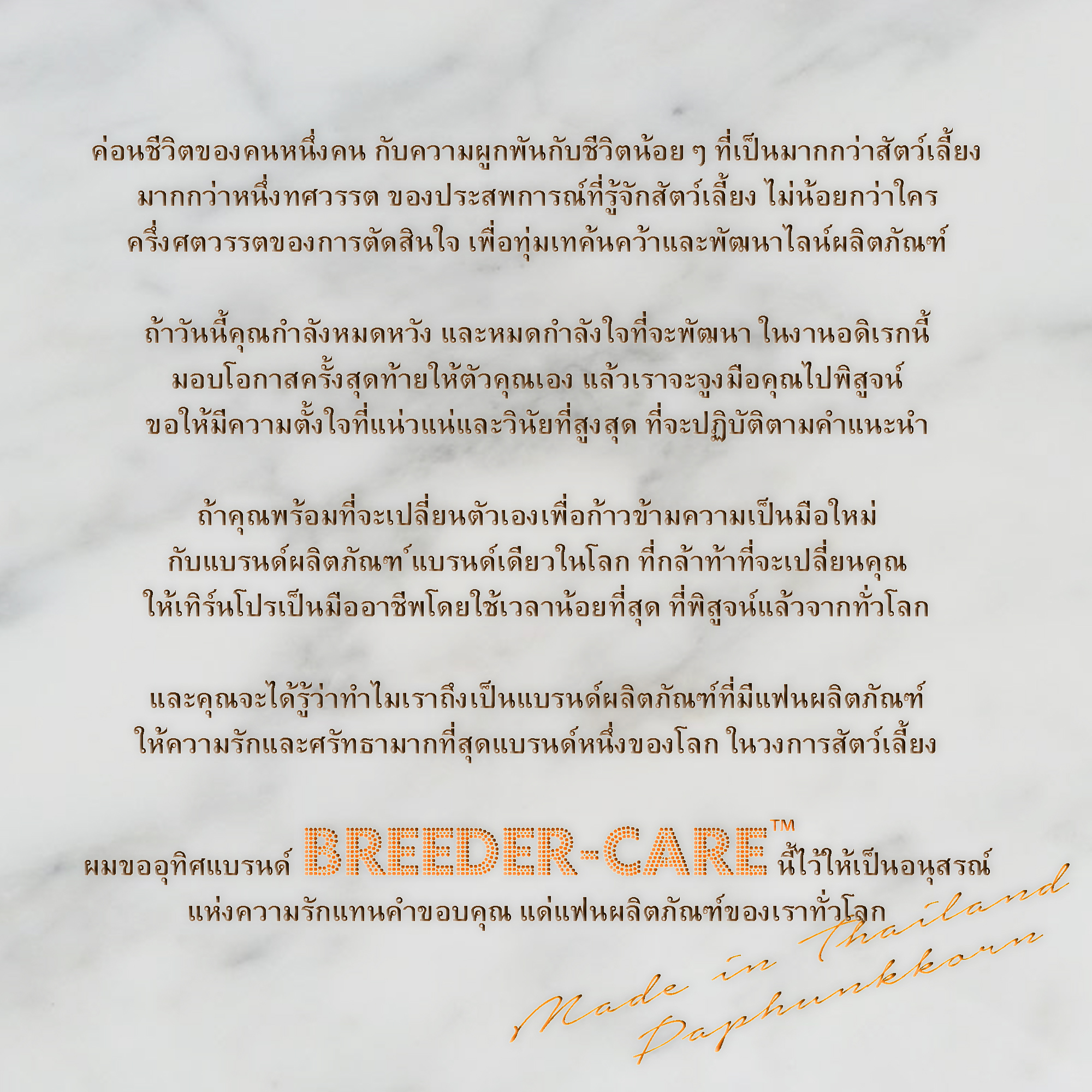 ผลิตภัณฑ์ทั้งหมดนับเป็นความภาคภูมิใจของเราในฐานะคนไทย ที่สามารถพัฒนาและเผยแพร่ชื่อเสียงในนามผลิตภัณฑ์จากประเทศไทยในเวทีโลก เพราะในเรื่องของข้อมูลแหล่งความรู้ต่างๆ นั้นต้องบอกว่าประเทศเรายัง ตามหลังทั้งทวีปยุโรปและอเมริกาอยู่มากมายนัก แต่ BREEDER-CARE™ ได้พลิกปูมประวัติศาสตร์ของ แบรนด์เดียวจากทวีปเอเซีย ที่ก้าวขึ้นสู่จุดที่บรีดเดอร์มืออาชีพจากหลายๆ สมาคมทั่วโลก ให้ความไว้วางใจ ที่จะใช้เป็นอาวุธคู่กายการกรูมมิ่งดูแลเด็กๆ เพื่อเตรียมความพร้อมสู่สนามประกวด ในหลายๆ งานประกวดที่จัดขึ้นอยู่ทั่วทั้ง 6 ทวีปในปัจจุบัน